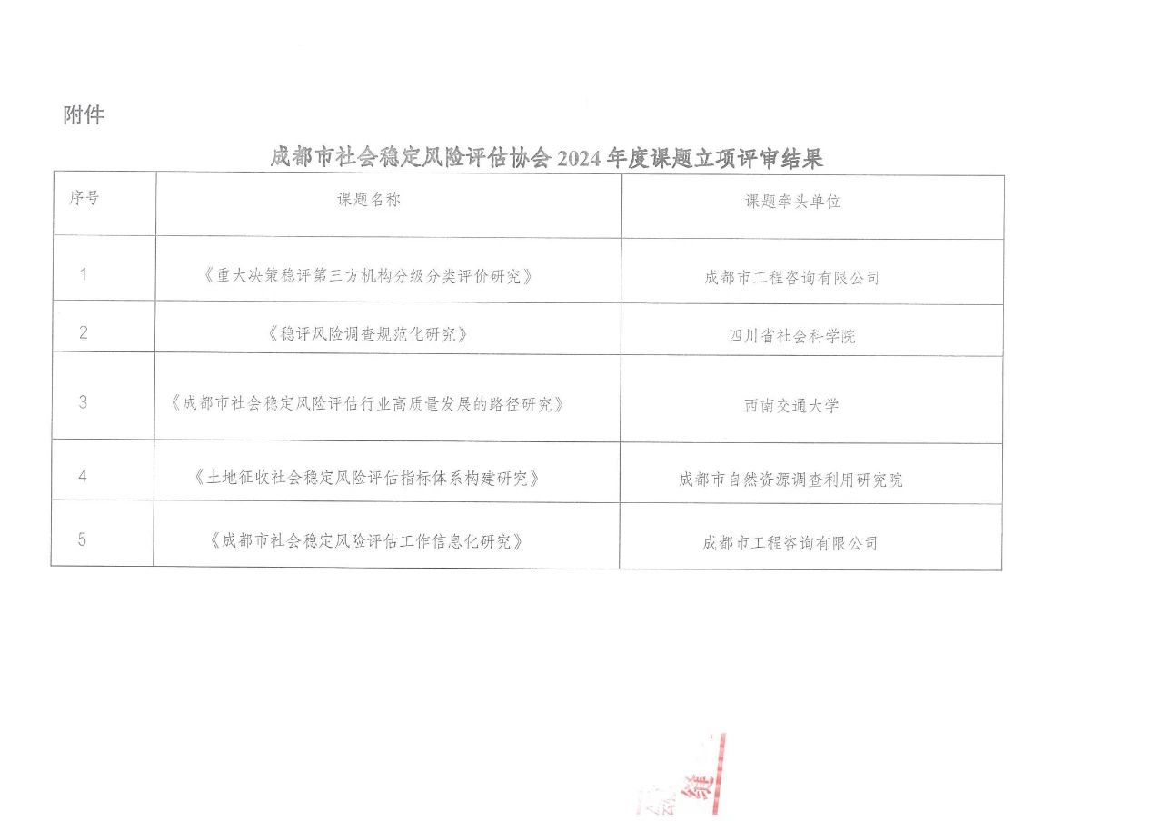 按照成都市社會(huì)穩(wěn)定風(fēng)險(xiǎn)評(píng)估協(xié)會(huì)《關(guān)于開(kāi)展2024年度課題研究申報(bào)工作的通知》要求,經(jīng)會(huì)員單位申報(bào)和專家組評(píng)估,擬對(duì)《重大決策穩(wěn)評(píng)第三方機(jī)構(gòu)分級(jí)分類評(píng)價(jià)研究》等5個(gè)課題進(jìn)行立項(xiàng)。