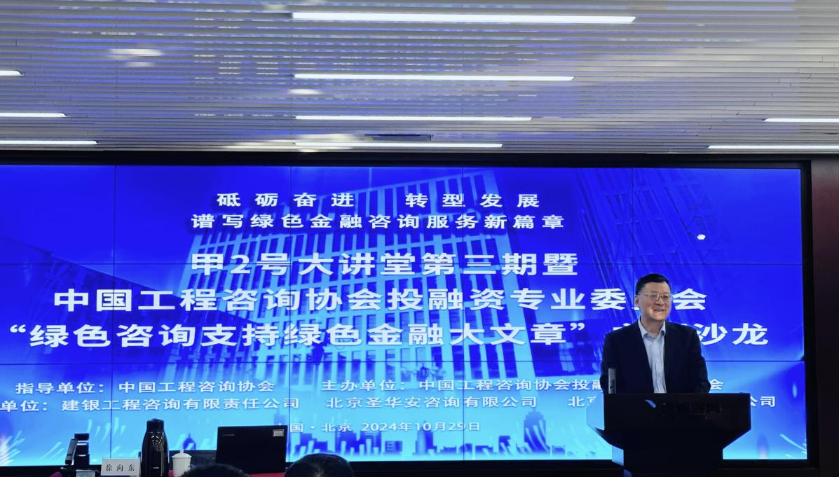 2024年10月29日,中國工程咨詢協(xié)會投融資專業(yè)委員會在北京成功舉辦了“綠色咨詢支持綠色金融大文章”主題沙龍。本次沙龍由建銀工程咨詢有限責任公司、北京財指南咨詢有限公司和北京圣華安咨詢有限公司承辦。建銀咨詢副總裁、執(zhí)行董事唐曉陽,業(yè)務總監(jiān)闕金聲、劉海濤等領導出席,沙龍活動由專委會秘書長闕金聲主持。