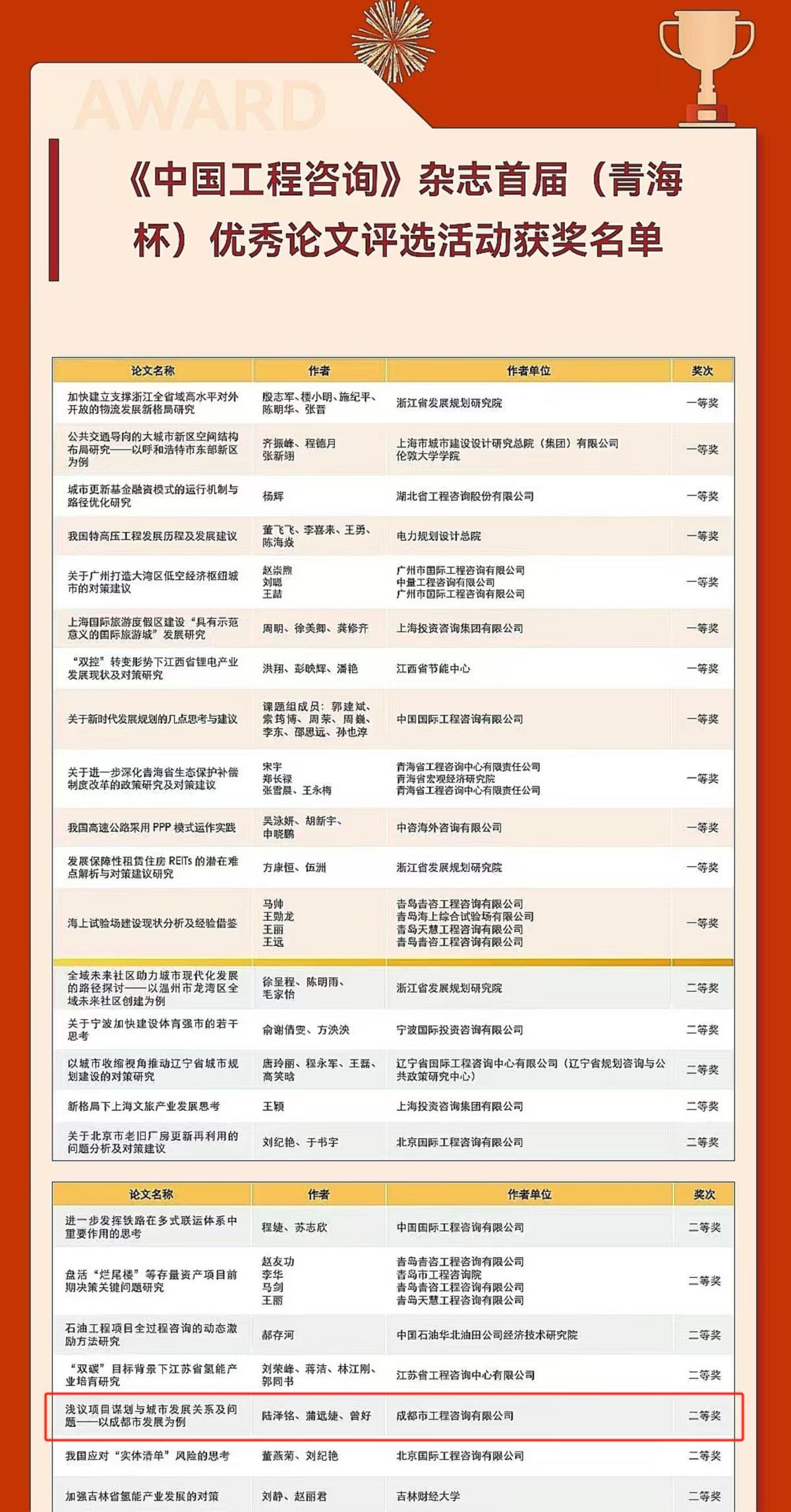 2024年8月7日,《中國工程咨詢》雜志首屆(青海杯)優(yōu)秀論文評選結(jié)果揭曉。成咨公司規(guī)劃與政策咨詢事業(yè)部陸澤銘、蒲遠婕、曾好發(fā)表在2023年第11期的《淺議項目謀劃與城市發(fā)展關(guān)系及問題——以成都市發(fā)展為例》一文在激烈的競爭中脫穎而出,成功獲得本屆優(yōu)秀論文評選二等獎。
